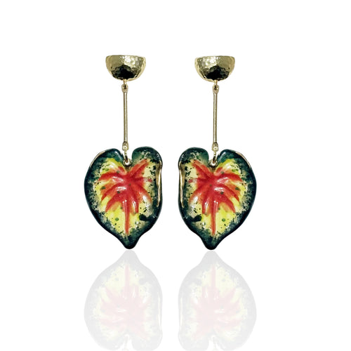 Elevate your style with these vibrant leaf-shaped drop earrings inspired by the caladium leaf. The hammered gold-tone stud tops add a touch of elegance.